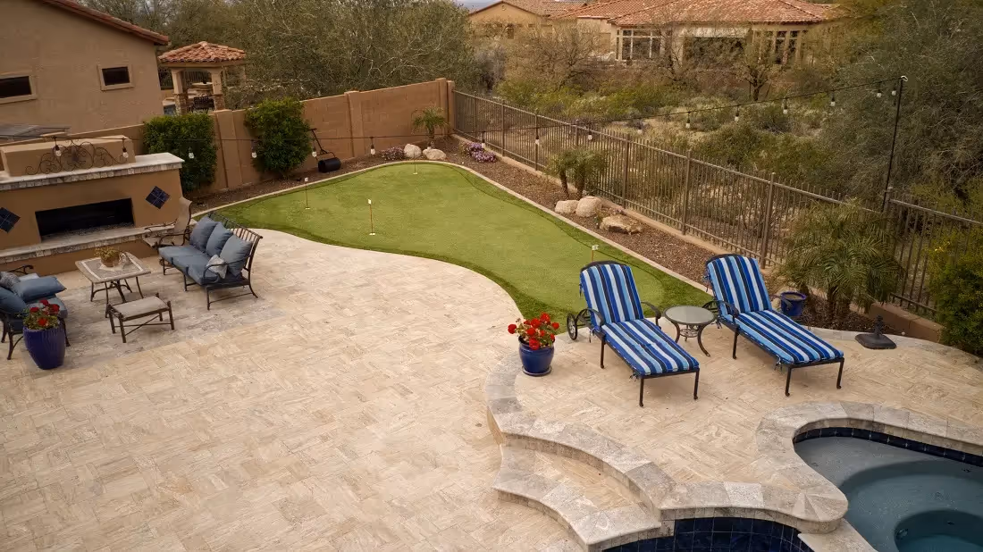 Elegant and practical, travertine runs $16-$26 per sq. ft. Naturally cool underfoot and visually timeless, it’s a favorite for sunny patios and pool areas. Its textured surface adds grip, though it requires occasional cleaning and sealing.