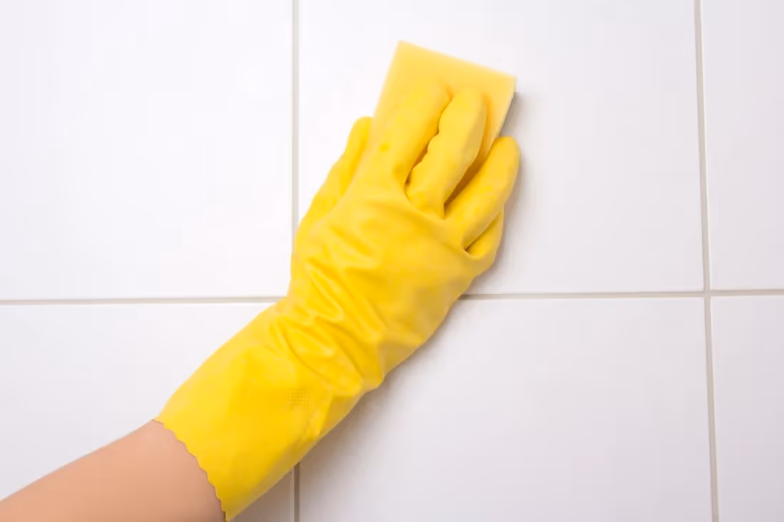 After the solution has sat for a few minutes, scrub the tiles gently with soft tools like a soft-bristled brush, microfiber cloth, or sponge. Work in circular motions and pay special attention to corners and textured surfaces.