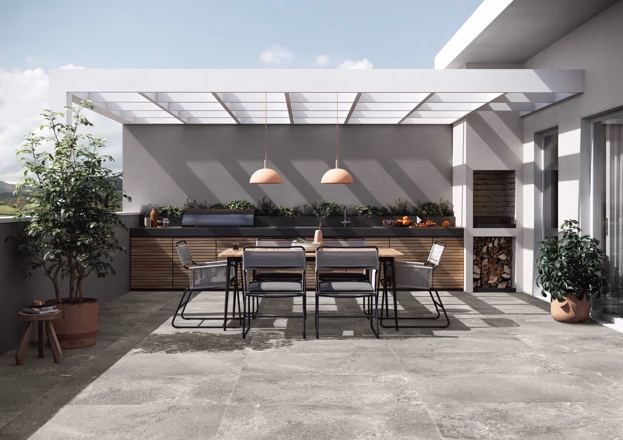 Chamonix 2 cm features expressive stone veining and rich mineral tones inspired by Alpine rock formations. Its sophisticated aesthetic makes it ideal for luxury patios, garden pathways, and outdoor commercial designs.
